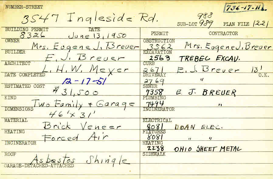 3547 Ingleside Road Shaker Heights, OH 44122 PARCEL ID: 736-17-011 Building Permit Date: 06-13-1950 Plan File Number: 1221 all scanned Microfilm Roll: Roll014 Neighborhood: Lomond Owner: Breuer, Mrs. Eugene J. Builder: Breuer, E. J. Architect: Meyer, L. H. W. Estimated Cost: 31500 Date Completed: 12-17-1951 Kind: Duplex or Two-Family and Garage Material: Brick Veneer Heating: Forced Air Roof: Asbestos Shingles |
