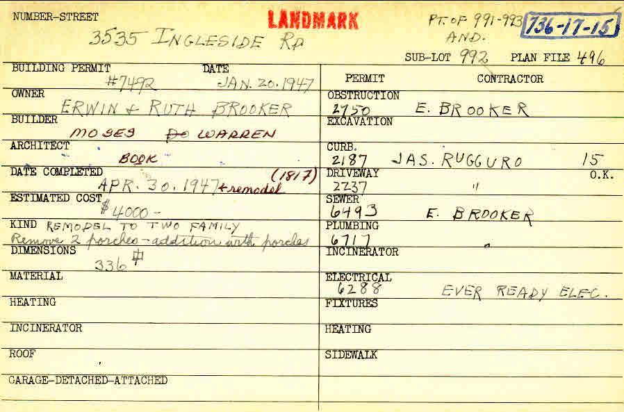 3535 Ingleside Road Shaker Heights, OH 44122 PARCEL ID: 736-17-015 Building Permit Date: 01-20-1947 Plan File Number: 496 all scanned Microfilm Roll: Roll005 Neighborhood: Lomond Owner: Brooker, Erwin and Ruth Builder: Warren, Moses Architect: Book Estimated Cost: 4000 Date Completed: 04-30-1947 Kind: Duplex or Two-Family Blueprints: online, see link above |