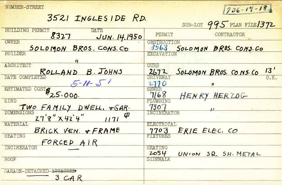 3521 Ingleside Road Shaker Heights, OH 44122 PARCEL ID: 736-17-018 Building Permit Date: 06-14-1950 Plan File Number: 1372 all scanned Microfilm Roll: Roll016 Neighborhood: Lomond Owner: Solomon Brothers Construction Company Builder: Solomon Brothers Construction Company Architect: Johns, Rolland B. Estimated Cost: 25000 Date Completed: 05-11-1951 Kind: Duplex or Two-Family and Garage Material: Brick Veneer and Frame Heating: Forced Air Garage: detached 3 car |