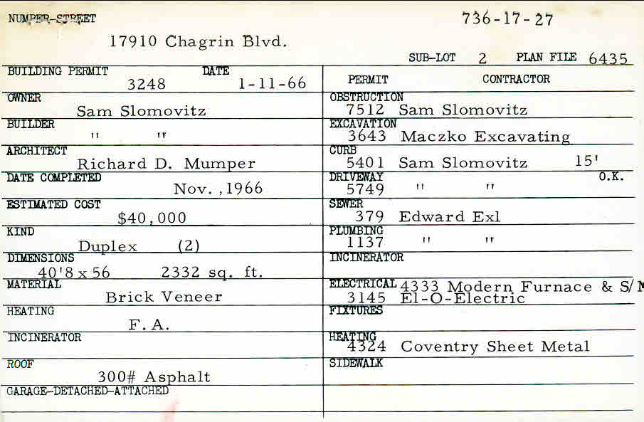 17910 Chagrin Boulevard Shaker Heights, OH 44122 PARCEL ID: 736-17-027 Building Permit Date: 01-11-1966 Plan File Number: 6435 Microfilm Roll: Roll#85 Neighborhood: Lomond Owner: Slomovitz, Sam Builder: Slomovitz, Sam Architect: Mumper, Richard D. Estimated Cost: 40000 Date Completed: 11-30-1966 Kind: Duplex or Two-Family Material: Brick Veneer Heating: Forced Air Roof: Asphalt |