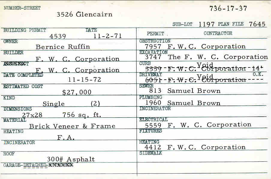 3526 Glencairn Road Shaker Heights, OH 44122 PARCEL ID: 736-17-037 Building Permit Date: 11-02-1971 Plan File Number: 7645 Microfilm Roll: Roll#94 Neighborhood: Lomond Owner: Ruffin, Bernice Builder: F. W. C. Corporation Architect: F. W. C. Corporation Estimated Cost: 27000 Date Completed: 11-15-1972 Kind: Single, Single Residence or Dwelling (2) Material: Brick Veneer and Frame Heating: Forced Air Roof: 300# Min Asphalt Garage: detached |