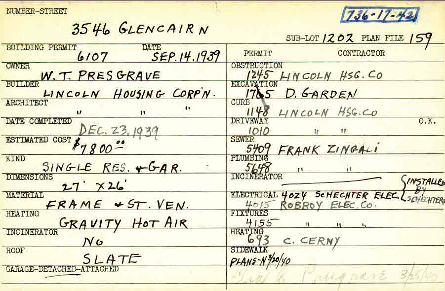 3546 Glencairn Road Shaker Heights, OH 44122 PARCEL ID: 736-17-042 Building Permit Date: 09-14-1939 Plan File Number: 159 Neighborhood: Lomond Owner: Presgrave, W. T. Builder: Lincoln Housing Corporation Architect: Lincoln Housing Corporation Estimated Cost: 7800 Date Completed: 12-23-1939 Kind: Single Dwelling and Garage Material: Frame and Stone Veneer Heating: Gravity System Roof: Slate Garage: detached Card Available: yes |