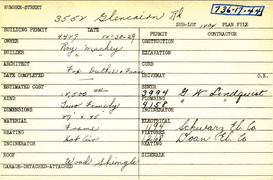 3552 Glencairn Road Shaker Heights, OH 44122 PARCEL ID: 736-17-044 Building Permit Date: 12-30-1929 Plan File Number: 3683 Microfilm Roll: Roll#55 Neighborhood: Lomond Owner: Mackey, Ray Builder: Mackey, Ray Architect: Fox, Duthie and Foose Estimated Cost: 12500 Kind: Duplex or Two-Family Material: Frame Heating: Hot Air Roof: Wood Shingle |