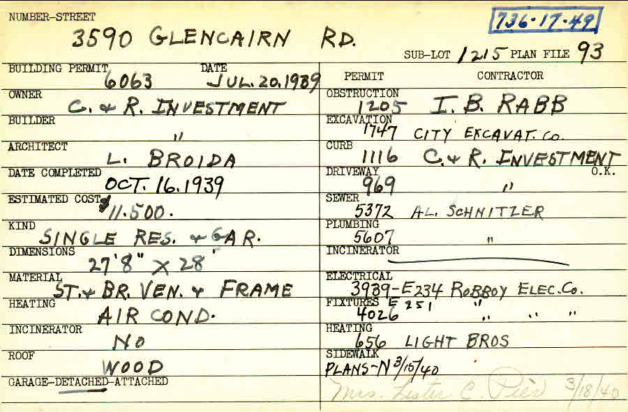 3590 Glencairn Road Shaker Heights, OH 44122 PARCEL ID: 736-17-049 Building Permit Date: 07-20-1939 Plan File Number: 93, 2927 scanned Microfilm Roll: Roll041, Roll#42 Neighborhood: Lomond Owner: C. and R. Investment Builder: C. and R. Investment Architect: Broida, L. Estimated Cost: 11500 Date Completed: 10-16-1939 Kind: Single Dwelling and Garage Material: Stone and Brick Veneer and Frame Heating: Air Conditioned Roof: Wood Garage: detached |