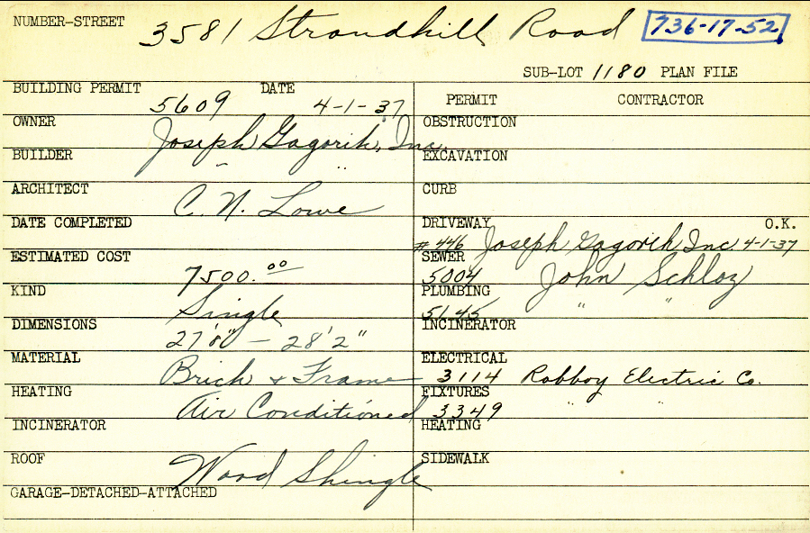 3581 Strandhill Road Shaker Heights, OH 44122 PARCEL ID: 736-17-052 Building Permit Date: 04-01-1937 Plan File Number: 4926 Microfilm Roll: Roll#68 Neighborhood: Lomond Owner: Joseph Gagorik, Inc. Builder: Joseph Gagorik, Inc. Architect: Lowe, C. N. Estimated Cost: 7500 Kind: Single, Single Residence or Dwelling Material: Brick and Frame Heating: Air Conditioned Roof: Wood Shingle |