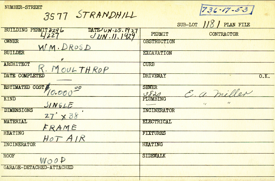 3577 Strandhill Road Shaker Heights, OH 44122 PARCEL ID: 736-17-053 Building Permit Date: 06-11-1929 Plan File Number: 0 Neighborhood: Lomond Owner: Drosd, William Builder: Drosd, William Architect: Moulthrop, R. Estimated Cost: 10000 Kind: Single, Single Residence or Dwelling Material: Frame Heating: Hot Air Roof: Wood Card Available: yes |