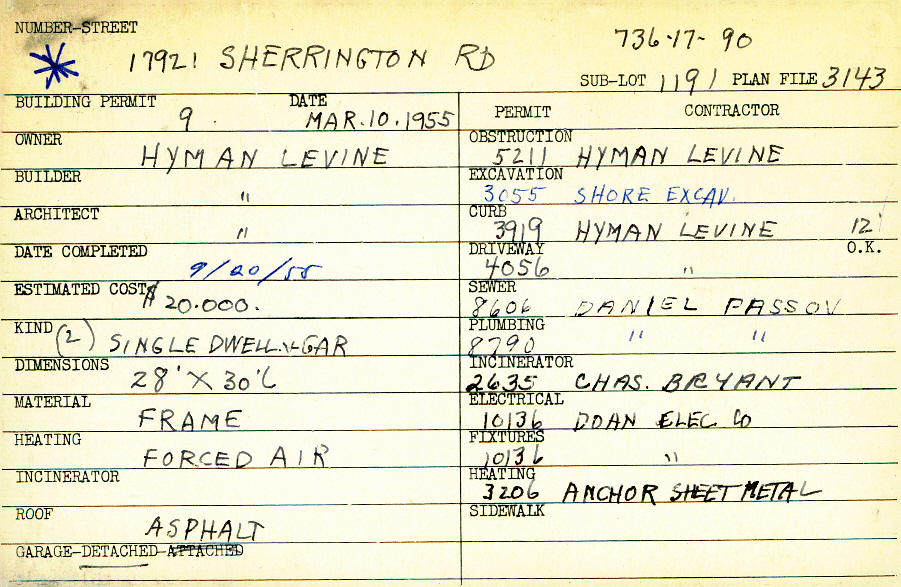 17921 Sherrington Road Shaker Heights, OH 44122 PARCEL ID: 736-17-090 Building Permit Date: 03-10-1955 Plan File Number: 3143 Microfilm Roll: Roll#44 Neighborhood: Lomond Owner: Levine, Hyman Builder: Levine, Hyman Architect: Levine, Hyman Estimated Cost: 20000 Date Completed: 09-20-1955 Kind: Single Dwelling and Garage (2) Material: Frame Heating: Forced Air Roof: Asphalt Garage: detached |