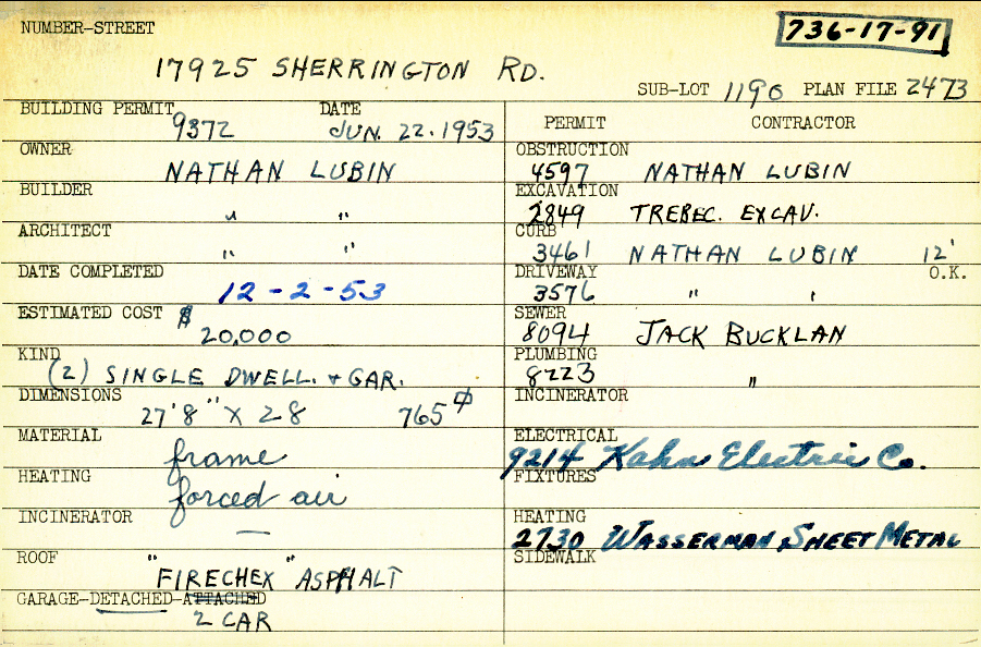 17925 Sherrington Road Shaker Heights, OH 44122 PARCEL ID: 736-17-091 Building Permit Date: 06-22-1953 Plan File Number: 2473, 4344 all scanned Microfilm Roll: Roll035, Roll062 Neighborhood: Lomond Owner: Lubin, Nathan Builder: Lubin, Nathan Architect: Lubin, Nathan Estimated Cost: 20000 Date Completed: 12-02-1953 Kind: Single Dwelling and Garage (2) Material: Frame Heating: Forced Air Roof: Asphalt Garage: detached 2 car |