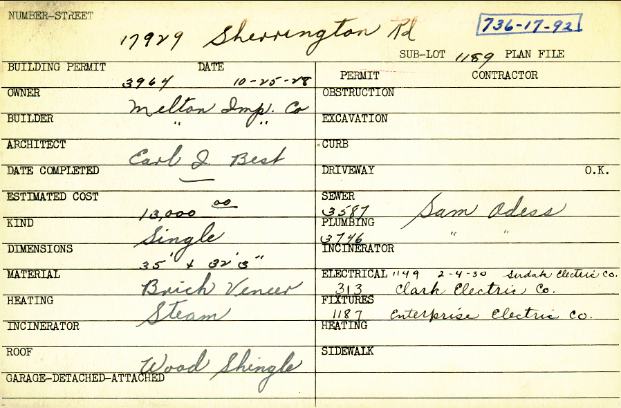 17929 Sherrington Road Shaker Heights, OH 44122 PARCEL ID: 736-17-092 Building Permit Date: 10-25-1928 Plan File Number: 0 Neighborhood: Lomond Owner: Melton Improvement Company Builder: Melton Improvement Company Architect: Best, Karl J. Estimated Cost: 13000 Kind: Single, Single Residence or Dwelling Material: Brick Veneer Heating: Steam Roof: Wood Shingle |
