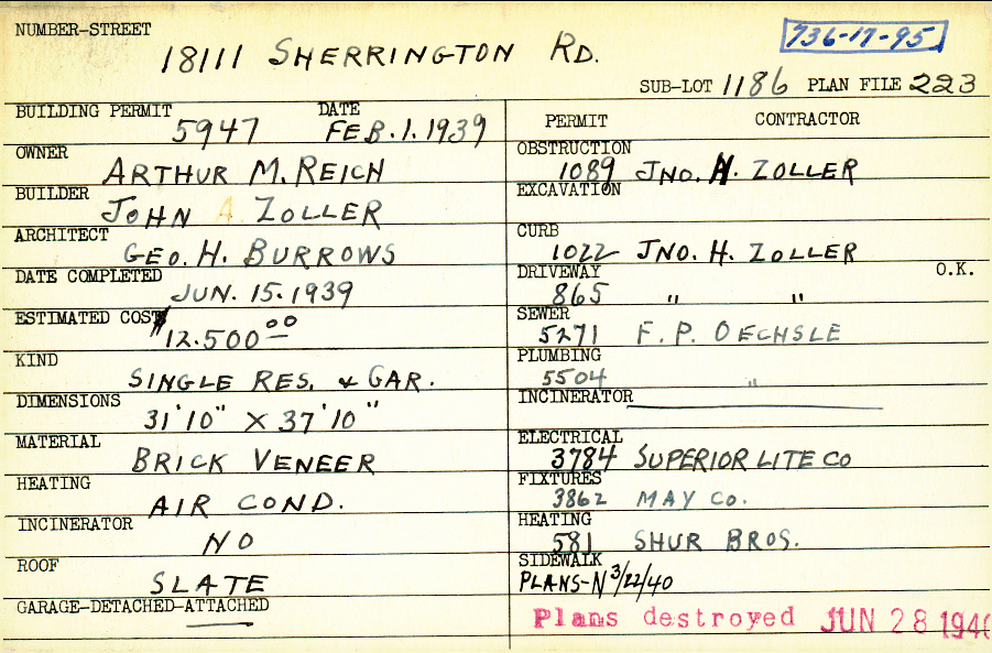 18111 Sherrington Road Shaker Heights, OH 44122 PARCEL ID: 736-17-095 Building Permit Date: 02-01-1939 Plan File Number: 223 Neighborhood: Lomond Owner: Reich, Arthur M. Builder: Zoller, John A. Architect: Burrows, George H. Estimated Cost: 12500 Date Completed: 06-15-1939 Kind: Single Dwelling and Garage Material: Brick Veneer Heating: Air Conditioned Roof: Slate Garage: attached Card Available: yes |