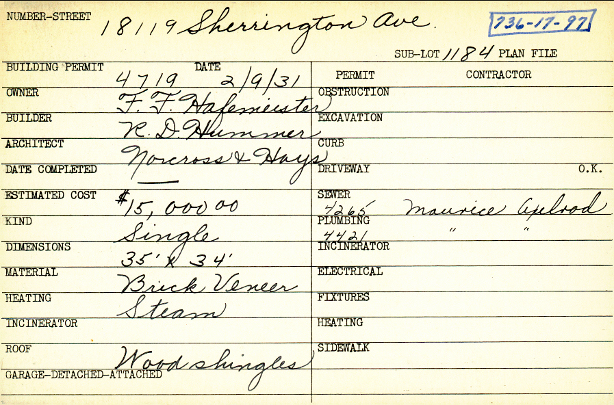 18119 Sherrington Road Shaker Heights, OH 44122 PARCEL ID: 736-17-097 Building Permit Date: 02-09-1931 Plan File Number: 0 Neighborhood: Lomond Owner: Hafemeister, F. F. Builder: Hummer, R. D. Architect: Norcross and Hays Estimated Cost: 15000 Kind: Single, Single Residence or Dwelling Material: Brick Veneer Heating: Steam Roof: Wood Shingle |