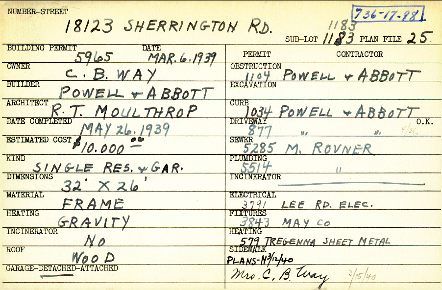 18123 Sherrington Road Shaker Heights, OH 44122 PARCEL ID: 736-17-098 Building Permit Date: 03-06-1939 Plan File Number: 25, 12576 Microfilm Roll: NewRoll#14 Neighborhood: Lomond Owner: Way, C. B. Builder: Powell and Abbott Architect: Moulthrop, R. T. Estimated Cost: 10000 Date Completed: 05-26-1939 Kind: Single Dwelling and Garage Material: Frame Heating: Gravity System Roof: Wood Garage: detached |