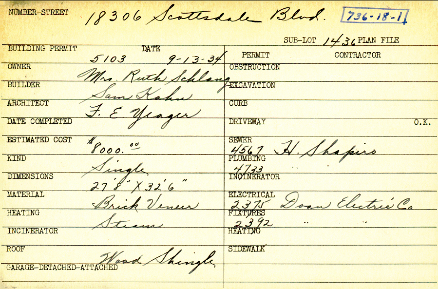 18306 Scottsdale Boulevard Shaker Heights, OH 44122 PARCEL ID: 736-18-001 Building Permit Date: 09-13-1934 Plan File Number: 0 Neighborhood: Lomond Owner: Schlang, Mrs. Ruth Builder: Kahn, Sam Architect: Yeager, Floyd E. Estimated Cost: 8000 Kind: Single, Single Residence or Dwelling Material: Brick Veneer Heating: Steam Roof: Wood Shingle |
