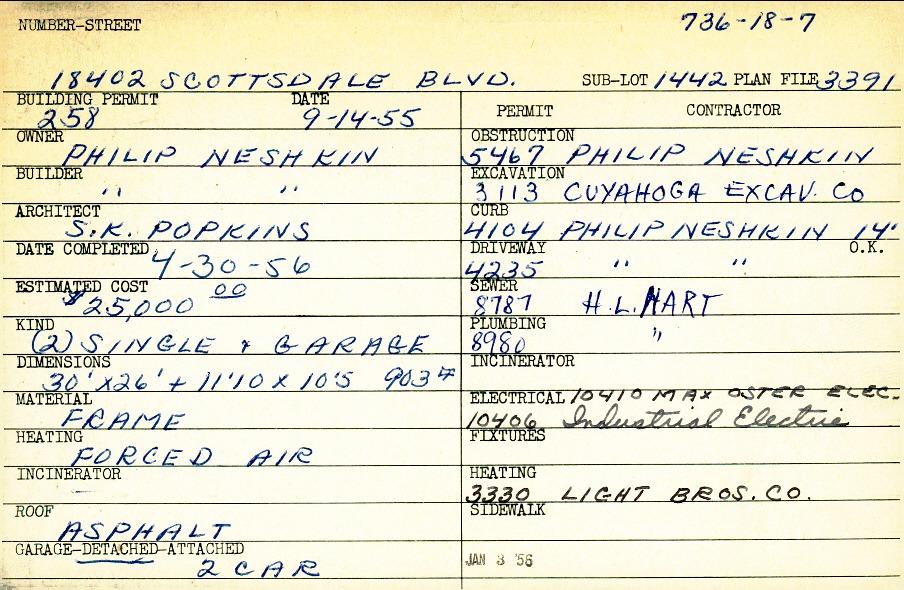 18402 Scottsdale Boulevard Shaker Heights, OH 44122 PARCEL ID: 736-18-007 Building Permit Date: 09-14-1955 Plan File Number: 3391 Microfilm Roll: Roll#49 Neighborhood: Lomond Owner: Neshkin, Philip Builder: Neshkin, Philip Architect: Popkins, S. K. Estimated Cost: 25000 Date Completed: 04-30-1956 Kind: Single Dwelling and Garage (2) Material: Frame Heating: Forced Air Roof: Asphalt Garage: detached 2 car |
