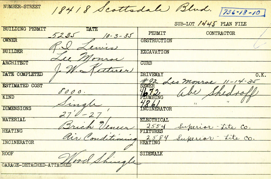 18418 Scottsdale Boulevard Shaker Heights, OH 44122 PARCEL ID: 736-18-010 Building Permit Date: 10-03-1935 Plan File Number: 0 Neighborhood: Lomond Owner: Lewis, R. I. Builder: Monroe, Lee Architect: Ketterer, J. W. Estimated Cost: 8000 Kind: Single, Single Residence or Dwelling Material: Brick Veneer Heating: Air Conditioned Roof: Wood Shingle Card Available: yes |