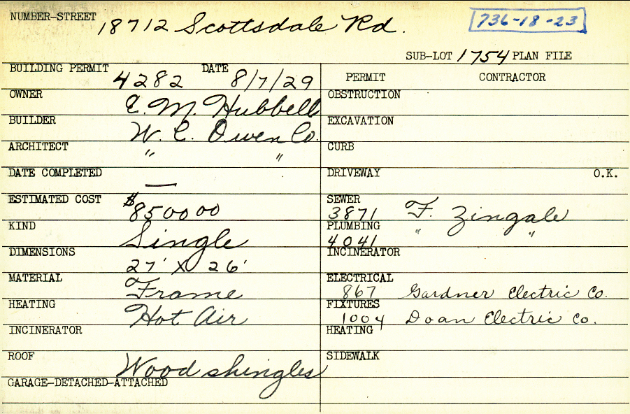 18712 Scottsdale Boulevard Shaker Heights, OH 44122 PARCEL ID: 736-18-023 Building Permit Date: 08-07-1929 Plan File Number: 0 Neighborhood: Lomond Owner: Hubbell. E. M. Builder: W. C. Owen Company Architect: W. C. Owen Company Estimated Cost: 8500 Kind: Single, Single Residence or Dwelling Material: Frame Heating: Hot Air Roof: Wood Shingle Card Available: yes |