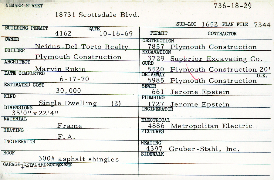 18731 Scottsdale Boulevard Shaker Heights, OH 44122 PARCEL ID: 736-18-029 Building Permit Date: 10-16-1969 Plan File Number: 7344, 7744 Microfilm Roll: Roll#92, Roll#94 Neighborhood: Sussex Owner: Neidus-Del Torto Realty Builder: Plymouth Construction Architect: Rukin, Marvin Estimated Cost: 30000 Date Completed: 06-17-1970 Kind: Single, Single Residence or Dwelling (2) Material: Frame Heating: Forced Air Roof: 300# Min Asphalt Garage: detached |