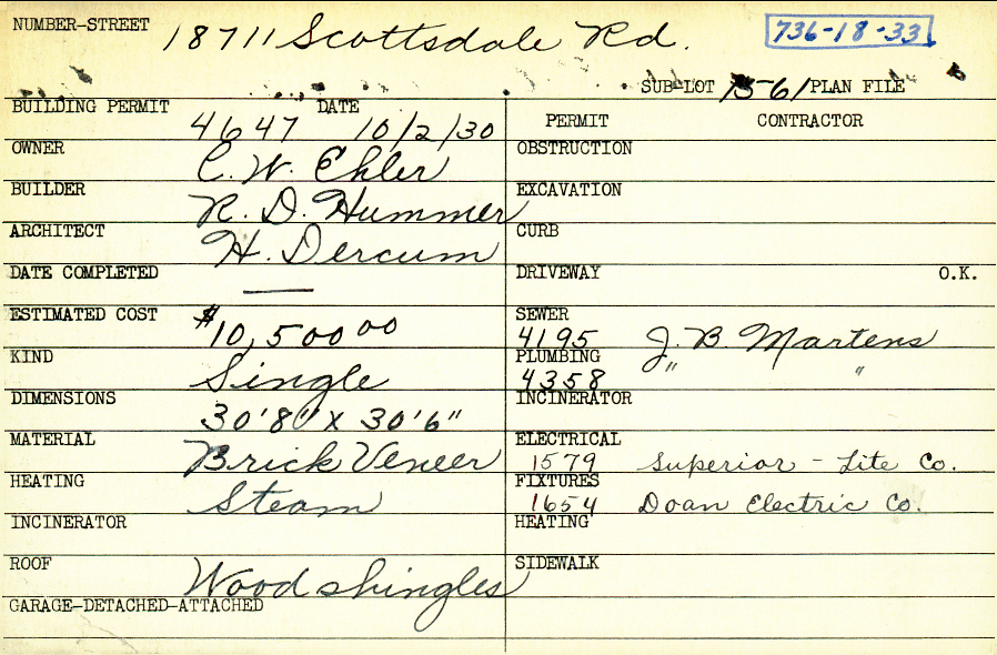 18711 Scottsdale Boulevard Shaker Heights, OH 44122 PARCEL ID: 736-18-033 Building Permit Date: 10-02-1930 Plan File Number: 0 Neighborhood: Lomond Owner: Ehler, C. W. Builder: Hummer, R. D. Architect: Dercum, H. Estimated Cost: 10500 Kind: Single, Single Residence or Dwelling Material: Brick Veneer Heating: Steam Roof: Wood Shingle Card Available: yes |