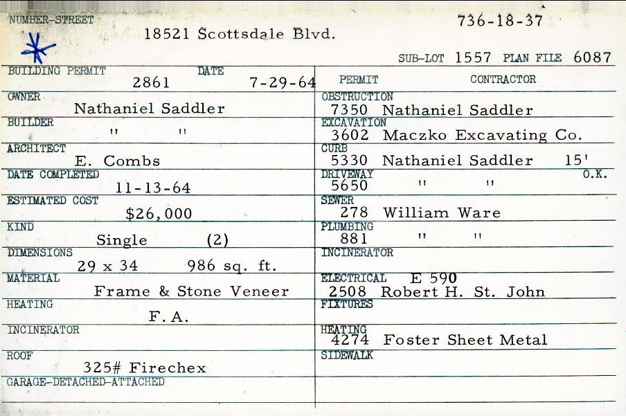 18521 Scottsdale Boulevard Shaker Heights, OH 44122 PARCEL ID: 736-18-037 Building Permit Date: 07-29-1964 Plan File Number: 6087 Microfilm Roll: Roll#81 Neighborhood: Lomond Owner: Saddler, Nathaniel Builder: Saddler, Nathaniel Architect: Combs, E. Estimated Cost: 26000 Date Completed: 11-13-1964 Kind: Single, Single Residence or Dwelling (2) Material: Frame and Stone Veneer Heating: Forced Air Roof: 325# Asphalt |
