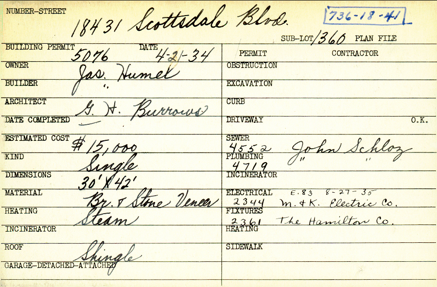 18431 Scottsdale Boulevard Shaker Heights, OH 44122 PARCEL ID: 736-18-041 Building Permit Date: 04-21-1934 Plan File Number: 0 Neighborhood: Lomond Owner: Humel, James Builder: Humel, James Architect: Burrows, G. H. Estimated Cost: 15000 Kind: Single, Single Residence or Dwelling Material: Brick and Stone Veneer Heating: Steam Roof: Shingles |
