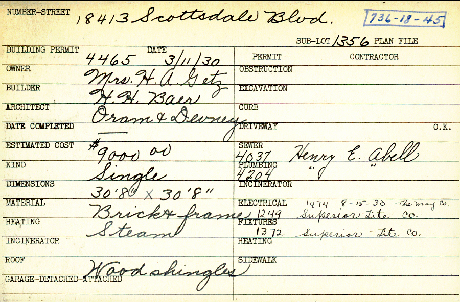 18413 Scottsdale Boulevard Shaker Heights, OH 44122 PARCEL ID: 736-18-045 Building Permit Date: 03-11-1930 Plan File Number: 1312 all scanned Microfilm Roll: Roll015 Neighborhood: Lomond Owner: Getz, Mrs. H. A. Builder: Baer, H. H. Architect: Oram and Devney Estimated Cost: 9000 Kind: Single, Single Residence or Dwelling Material: Brick and Frame Heating: Steam Roof: Wood Shingle |