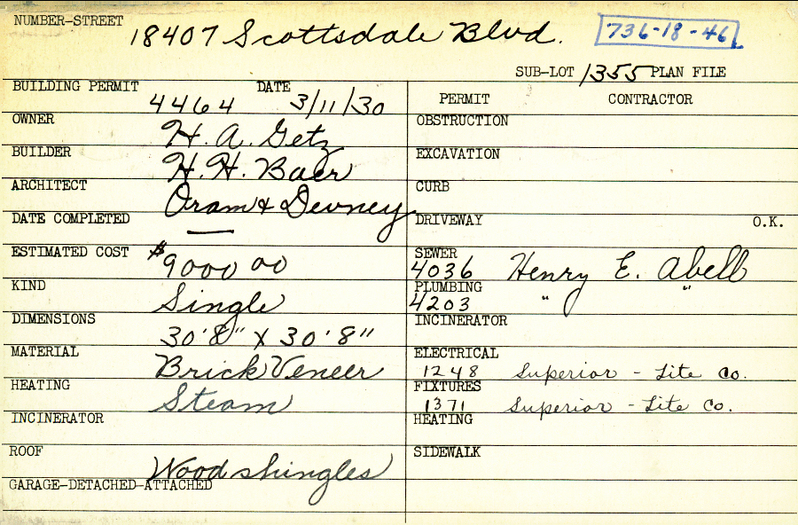 18407 Scottsdale Boulevard Shaker Heights, OH 44122 PARCEL ID: 736-18-046 Building Permit Date: 03-11-1930 Plan File Number: 0 Neighborhood: Lomond Owner: Getz, H. A Builder: Baer, H. H. Architect: Oram and Devney Estimated Cost: 9000 Kind: Single, Single Residence or Dwelling Material: Brick Veneer Heating: Steam Roof: Wood Shingle Card Available: yes |