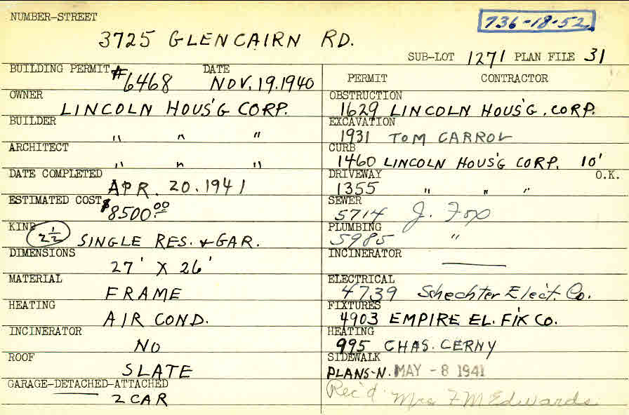 3725 Glencairn Road Shaker Heights, OH 44122 PARCEL ID: 736-18-052 Building Permit Date: 11-19-1940 Plan File Number: 31 Neighborhood: Fernway Owner: Lincoln Housing Corporation Builder: Lincoln Housing Corporation Architect: Lincoln Housing Corporation Estimated Cost: 8500 Date Completed: 04-20-1941 Kind: Single Dwelling and Garage (2) Material: Frame Heating: Air Conditioned Roof: Slate Garage: detached 2 car Card Available: yes |