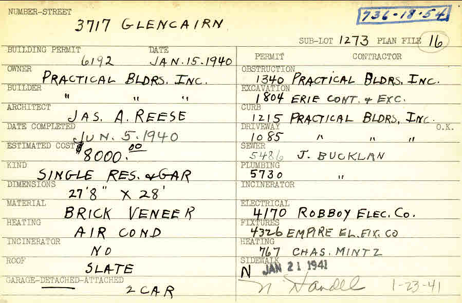 3717 Glencairn Road Shaker Heights, OH 44122 PARCEL ID: 736-18-054 Building Permit Date: 01-15-1940 Plan File Number: 16, 5797 Microfilm Roll: Roll#78 Neighborhood: Fernway Owner: Practical Builders, Inc. Builder: Practical Builders, Inc. Architect: Reese, James A. Estimated Cost: 8000 Date Completed: 06-05-1940 Kind: Single Dwelling and Garage Material: Brick Veneer Heating: Air Conditioned Roof: Slate Garage: detached 2 car |