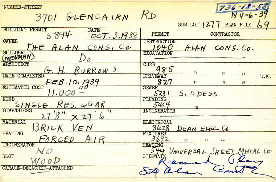 3701 Glencairn Road Shaker Heights, OH 44122 PARCEL ID: 736-18-058 Building Permit Date: 10-03-1938 Plan File Number: 69 Neighborhood: Fernway Owner: The Alan Construction Company (Newman) Builder: The Alan Construction Company (Newman) Architect: Burrows, G. H. Estimated Cost: 11000 Date Completed: 02-10-1939 Kind: Single Dwelling and Garage Material: Brick Veneer Heating: Forced Air Roof: Wood Garage: detached |