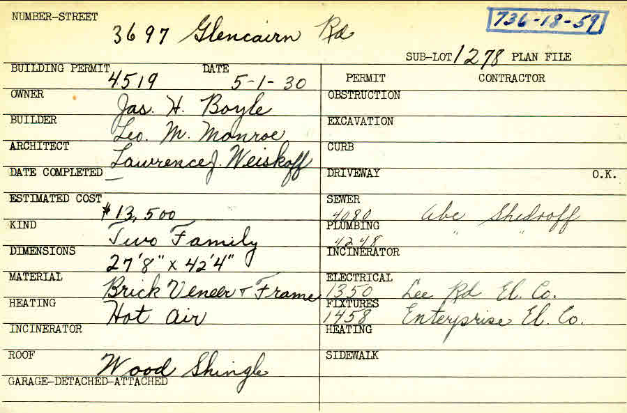 3697 Glencairn Road Shaker Heights, OH 44122 PARCEL ID: 736-18-059 Building Permit Date: 05-01-1930 Plan File Number: 0 Neighborhood: Fernway Owner: Boyle, James H. Builder: Monroe, Leo M. Architect: Weiskoff, Lawrence J. Estimated Cost: 13500 Kind: Duplex or Two-Family Material: Brick Veneer and Frame Heating: Hot Air Roof: Wood Shingle Card Available: yes |