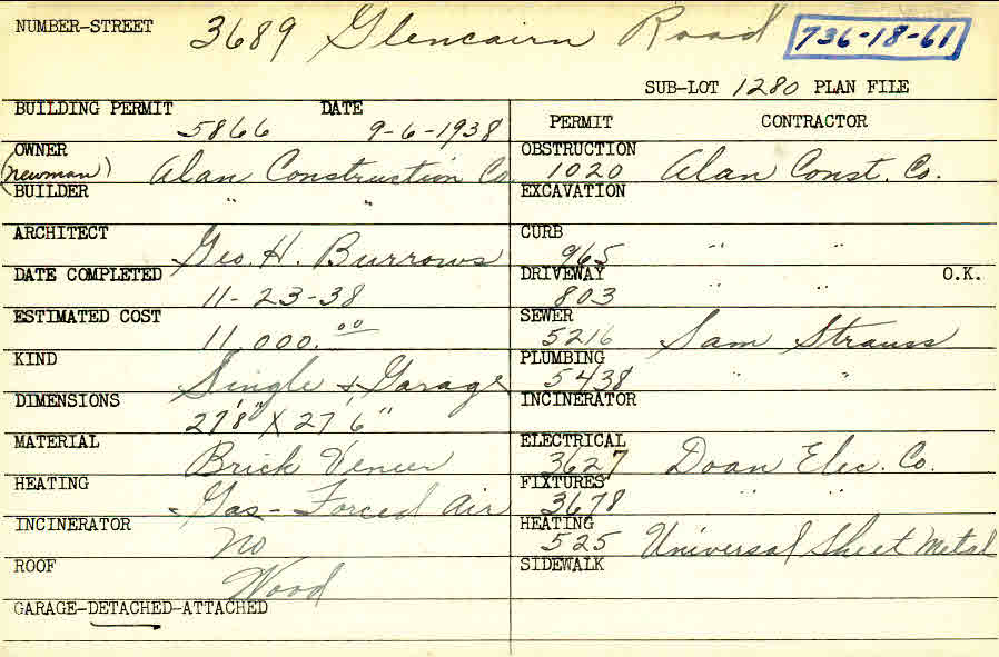 3689 Glencairn Road Shaker Heights, OH 44122 PARCEL ID: 736-18-061 Building Permit Date: 09-06-1938 Plan File Number: 0 Neighborhood: Fernway Owner: Alan Construction Company (Newman) Builder: Alan Construction Company (Newman) Architect: Burrows, George H. Estimated Cost: 11000 Date Completed: 11-23-1938 Kind: Single Dwelling and Garage Material: Brick Veneer Heating: Forced Air - Gas Roof: Wood Garage: detached Card Available: yes |