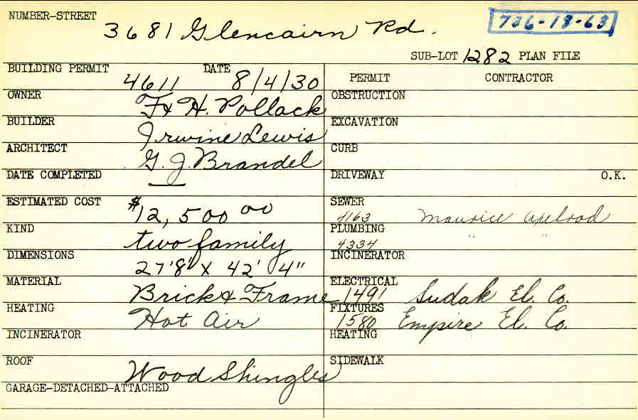 3681 Glencairn Road Shaker Heights, OH 44122 PARCEL ID: 736-18-063 Building Permit Date: 08-04-1930 Plan File Number: 0 Neighborhood: Fernway Owner: Pollack, F. and H. Builder: Lewis, Irwine Architect: Brandel, G. J. Estimated Cost: 12500 Kind: Duplex or Two-Family Material: Brick and Frame Heating: Hot Air Roof: Wood Shingle Card Available: yes |