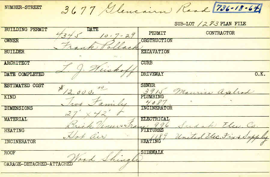 3677 Glencairn Road Shaker Heights, OH 44122 PARCEL ID: 736-18-064 Building Permit Date: 10-07-1929 Plan File Number: 1347 all scanned Microfilm Roll: Roll015 Owner: Pollack, Frank Builder: Pollack, Frank Architect: Weiskoff, L. J. Estimated Cost: 12000 Kind: Duplex or Two-Family Material: Brick Veneer and Frame Heating: Hot Air Roof: Wood Shingle |