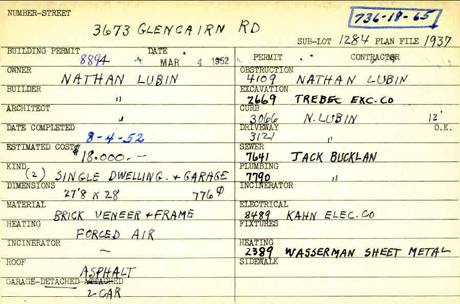 3673 Glencairn Road Shaker Heights, OH 44122 PARCEL ID: 736-18-065 Building Permit Date: 03-04-1952 Plan File Number: 1937 all scanned Microfilm Roll: Roll029 Owner: Lubin, Nathan Builder: Lubin, Nathan Architect: Lubin, Nathan Estimated Cost: 18000 Date Completed: 08-04-1952 Kind: Single Dwelling and Garage (2) Material: Brick Veneer and Frame Heating: Forced Air Roof: Asphalt Garage: detached 2 car |