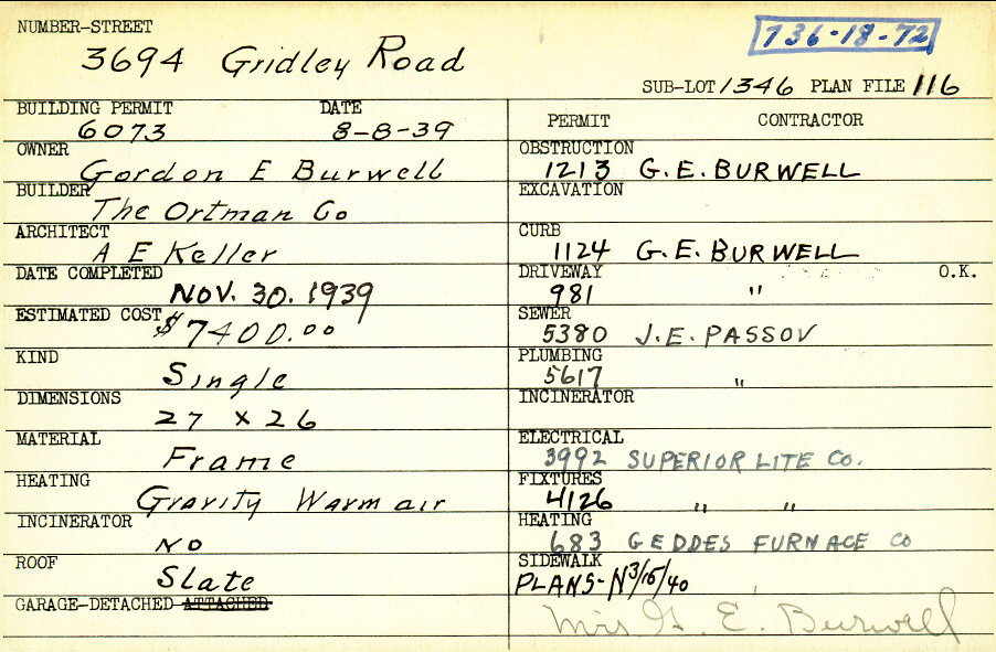 3694 Gridley Road Shaker Heights, OH 44122 PARCEL ID: 736-18-072 Building Permit Date: 08-08-1939 Plan File Number: 116 Neighborhood: Lomond Owner: Burwell, Gordon E. Builder: The Ortman Company Architect: Keller, Arthur Emil Estimated Cost: 7400 Date Completed: 11-30-1939 Kind: Single, Single Residence or Dwelling Material: Frame Heating: Gravity System Roof: Slate Garage: detached |