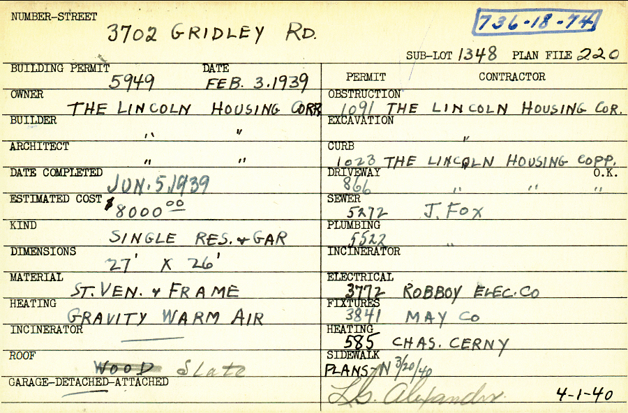 3702 Gridley Road Shaker Heights, OH 44122 PARCEL ID: 736-18-074 Building Permit Date: 02-03-1939 Plan File Number: 220 Neighborhood: Lomond Owner: The Lincoln Housing Corporation Builder: The Lincoln Housing Corporation Architect: The Lincoln Housing Corporation Estimated Cost: 8000 Date Completed: 06-05-1939 Kind: Single Dwelling and Garage Material: Stone Veneer and Frame Heating: Gravity System Roof: Slate Garage: detached Card Available: yes |