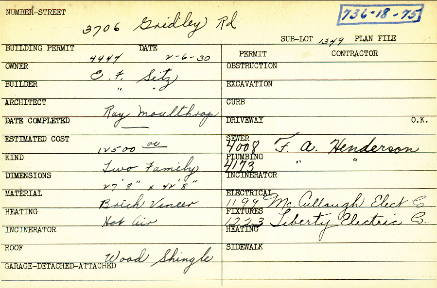 3706 Gridley Road Shaker Heights, OH 44122 PARCEL ID: 736-18-075 Building Permit Date: 02-06-1930 Plan File Number: 7843 Microfilm Roll: Roll#94 Neighborhood: Lomond Owner: Sitz, E. F. Builder: Sitz, E. F. Architect: Moulthrop, Ray Estimated Cost: 12500 Kind: Duplex or Two-Family Material: Brick Veneer Heating: Hot Air Roof: Wood Shingle |