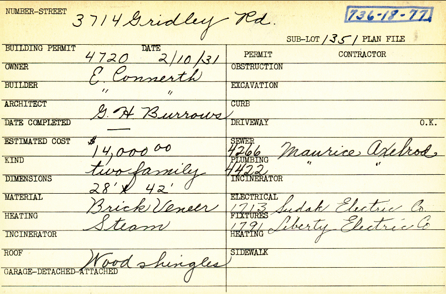 3714 Gridley Road Shaker Heights, OH 44122 PARCEL ID: 736-18-077 Building Permit Date: 02-10-1931 Plan File Number: 0 Neighborhood: Lomond Owner: Connerth, E. Builder: Connerth, E. Architect: Burrows, G. H. Estimated Cost: 14000 Kind: Duplex or Two-Family Material: Brick Veneer Heating: Steam Roof: Wood Shingle |