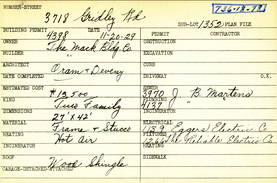 3718 Gridley Road Shaker Heights, OH 44122 PARCEL ID: 736-18-078 Building Permit Date: 11-20-1929 Plan File Number: 3214, 6607 Microfilm Roll: Roll#47, Roll#87 Neighborhood: Lomond Owner: The Mack Building Company Builder: The Mack Building Company Architect: Oram and Devney Estimated Cost: 13500 Kind: Duplex or Two-Family Material: Frame and Stucco Heating: Hot Air Roof: Wood Shingle |