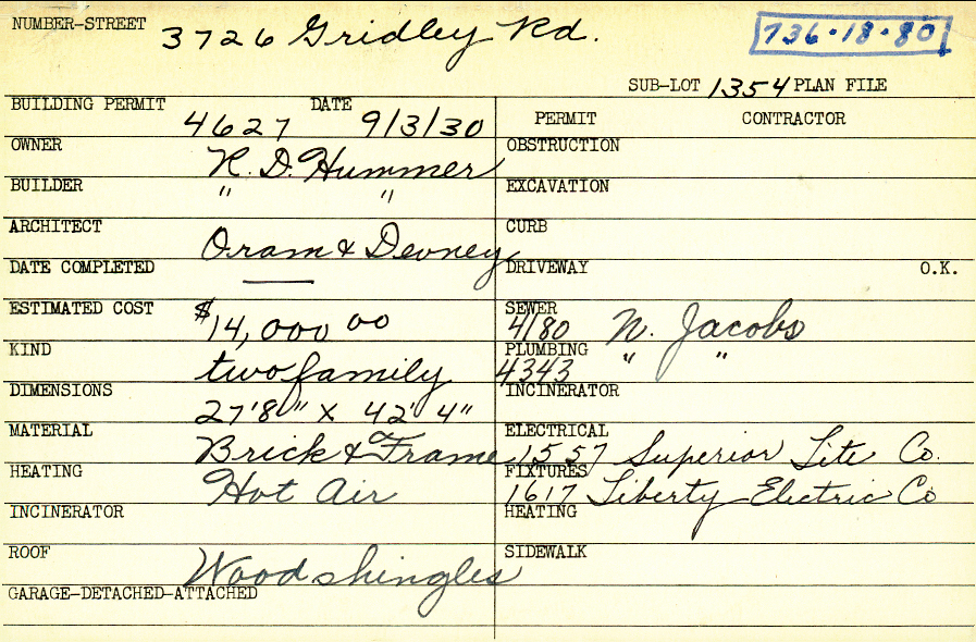 3726 Gridley Road Shaker Heights, OH 44122 PARCEL ID: 736-18-080 Building Permit Date: 09-03-1930 Plan File Number: 412 all scanned Microfilm Roll: Roll004 Neighborhood: Lomond Owner: Hummer, R. D. Builder: Hummer, R. D. Architect: Oram and Devney Estimated Cost: 14000 Kind: Duplex or Two-Family Material: Brick and Frame Heating: Hot Air Roof: Wood Shingle Blueprints: online, see link above |