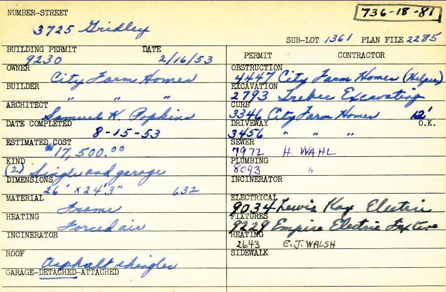 3725 Gridley Road Shaker Heights, OH 44122 PARCEL ID: 736-18-081 Building Permit Date: 02-16-1953 Plan File Number: 2285 Neighborhood: Lomond Owner: City Farm Homes Builder: City Farm Homes Architect: Popkins, Samuel K. Estimated Cost: 17500 Date Completed: 08-15-1953 Kind: Single Dwelling and Garage (2) Material: Frame Heating: Forced Air Roof: Asphalt Shingles Garage: detached Card Available: yes |