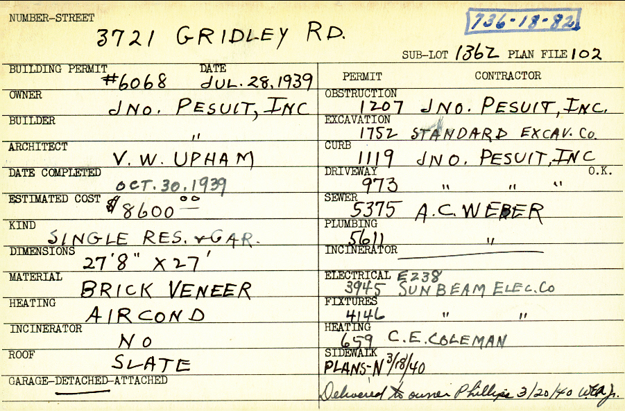 3721 Gridley Road Shaker Heights, OH 44122 PARCEL ID: 736-18-082 Building Permit Date: 07-28-1939 Plan File Number: 102 Neighborhood: Lomond Owner: John Pesuit, Inc. Builder: John Pesuit, Inc. Architect: Upham, V. W. Estimated Cost: 8600 Date Completed: 10-30-1939 Kind: Single Dwelling and Garage Material: Brick Veneer Heating: Air Conditioned Roof: Slate Garage: detached |