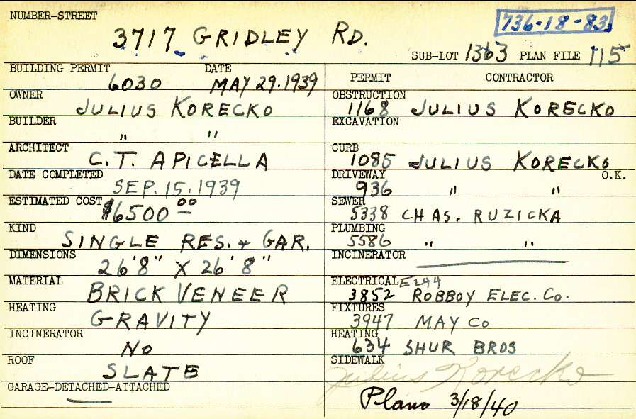 3717 Gridley Road Shaker Heights, OH 44122 PARCEL ID: 736-18-083 Building Permit Date: 05-29-1939 Plan File Number: 115 Neighborhood: Lomond Owner: Korecko, Julius Builder: Korecko, Julius Architect: Apicella, C. T. Estimated Cost: 6500 Date Completed: 09-15-1939 Kind: Single Dwelling and Garage Material: Brick Veneer Heating: Gravity System Roof: Slate Garage: detached Card Available: yes |