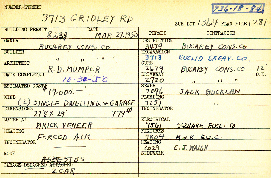 3713 Gridley Road Shaker Heights, OH 44122 PARCEL ID: 736-18-084 Building Permit Date: 03-27-1950 Plan File Number: 1281 all scanned Microfilm Roll: Roll015 Neighborhood: Lomond Owner: Bucarey Construction Company Builder: Bucarey Construction Company Architect: Mumper, R. D. Estimated Cost: 17000 Date Completed: 10-30-1950 Kind: Single Dwelling and Garage (2) Material: Brick Veneer Heating: Forced Air Roof: Asbestos Garage: detached 2 car |