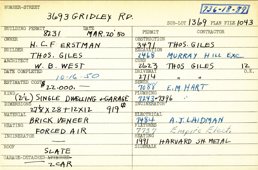 3693 Gridley Road Shaker Heights, OH 44122 PARCEL ID: 736-18-089 Building Permit Date: 03-20-1950 Plan File Number: 1043 all scanned Microfilm Roll: Roll013 Neighborhood: Lomond Owner: Erstman, H. C. F. Builder: Giles, Thomas Architect: West, W. B. Estimated Cost: 22000 Date Completed: 10-16-1950 Kind: Single 2-1/2 Material: Brick Veneer Heating: Forced Air Roof: Slate Garage: detached 2 car |