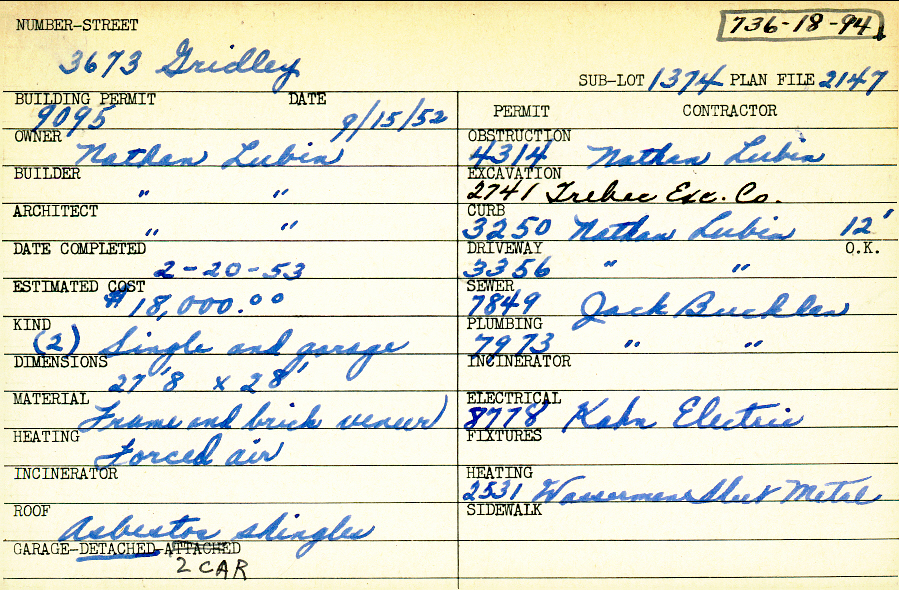 3673 Gridley Road Shaker Heights, OH 44122 PARCEL ID: 736-18-094 Building Permit Date: 09-15-1952 Plan File Number: 2147 Microfilm Roll: Roll#32 Neighborhood: Lomond Owner: Lubin, Nathan Builder: Lubin, Nathan Architect: Lubin, Nathan Estimated Cost: 18000 Date Completed: 02-20-1953 Kind: Single Dwelling and Garage (2) Material: Frame and Brick Veneer Heating: Forced Air Roof: Asbestos Shingles Garage: detached 2 car |