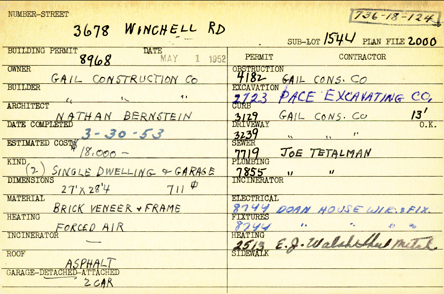 3678 Winchell Road Shaker Heights, OH 44122 PARCEL ID: 736-18-124 Building Permit Date: 05-01-1952 Plan File Number: 2000, 2459 scanned Microfilm Roll: Roll#30, Roll035 Neighborhood: Lomond Owner: Gail Construction Company Builder: Gail Construction Company Architect: Bernstein, Nathan Estimated Cost: 18000 Date Completed: 03-30-1953 Kind: Single Dwelling and Garage (2) Material: Brick Veneer and Frame Heating: Forced Air Roof: Asphalt Garage: detached 2 car |