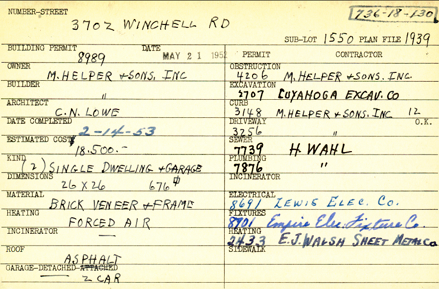 3702 Winchell Road Shaker Heights, OH 44122 PARCEL ID: 736-18-130 Building Permit Date: 05-21-1952 Plan File Number: 1939 Microfilm Roll: Roll#29 Neighborhood: Lomond Owner: M. Helper and Sons, Inc. Builder: M. Helper and Sons, Inc. Architect: Lowe, C. N. Estimated Cost: 18500 Date Completed: 02-14-1953 Kind: Single Dwelling and Garage (2) Material: Brick Veneer and Frame Heating: Forced Air Roof: Asphalt Garage: detached 2 car |