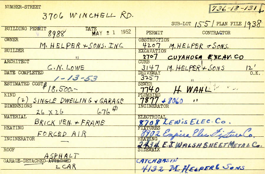 3706 Winchell Road Shaker Heights, OH 44122 PARCEL ID: 736-18-131 Building Permit Date: 05-21-1952 Plan File Number: 1938 Microfilm Roll: Roll#29 Neighborhood: Lomond Owner: M. Helper and Sons, Inc. Builder: M. Helper and Sons, Inc. Architect: Lowe, C. N. Estimated Cost: 18500 Date Completed: 01-13-1953 Kind: Single Dwelling and Garage (2) Material: Brick Veneer and Frame Heating: Forced Air Roof: Asphalt Garage: detached 2 car |