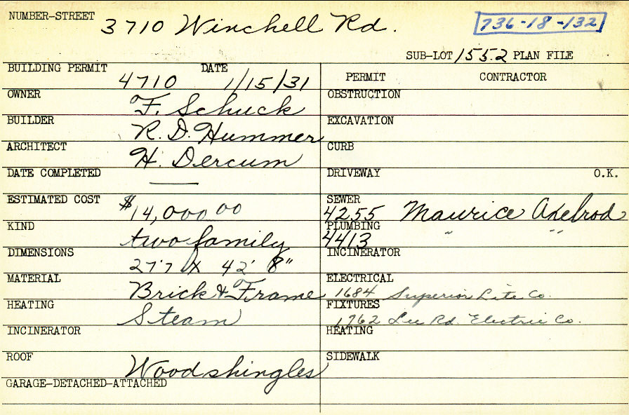 3710 Winchell Road Shaker Heights, OH 44122 PARCEL ID: 736-18-132 Building Permit Date: 01-15-1931 Plan File Number: 0 Neighborhood: Lomond Owner: Schuck, F. Builder: Hummer, R. D. Architect: Dercum, H. Estimated Cost: 14000 Kind: Duplex or Two-Family Material: Brick and Frame Heating: Steam Roof: Wood Shingle |